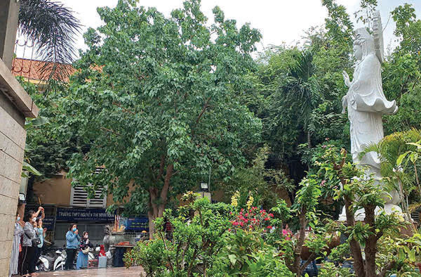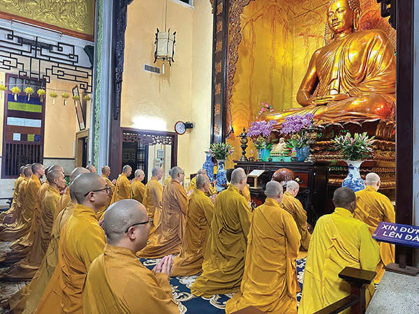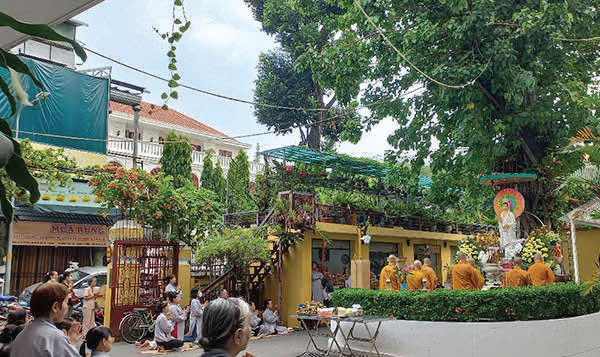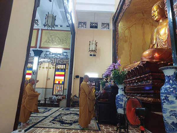 Do chùa có 2 tượng Quan Thế Âm, nên Ban Quản trị tổ chức đi kinh hành qua 2 tượng. Chư Tăng dẫn đầu đoàn kinh hành vừa Phật tử cùng niệm chú Đại bi.