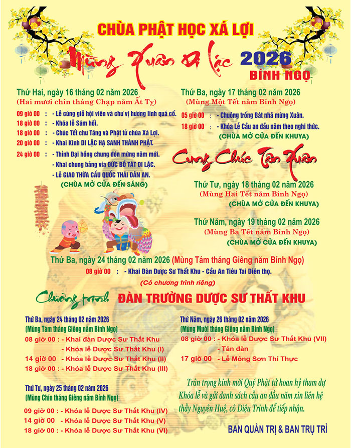 Chương trình Tết Bính Ngọ 2026 (PL 2569) tại Chùa Phật học Xá Lợi diễn ra từ ngày Thứ Hai 16-02-2026 (29 tháng Chạp năm Ất Tỵ) đến ngày 26-02-2026 (mùng 10 tháng Giêng năm Bính Ngọ). Kính mời quý Phật tử hoan hỉ tham gia Chương trình Tết Bính Ngọ và các khóa lễ tại Chùa.